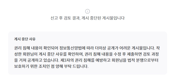 이 안내는 정보통신망법(약칭)에 따른 피해소명이 접수되어 게시물이 차단된 경우 표시하는 메시지 입니다.